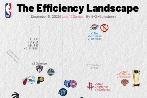 横轴代表进攻效率,越靠右越好,纵轴代表防守效率,越靠上越强。第一象限的球队多为发挥出色的球队,而在第三象限的球队通常为战绩比较糟糕的球队。