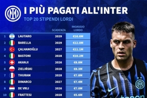 国米税前年薪排名:劳塔罗1660万欧居首,四名球员超1000万欧
