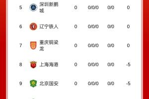 新赛季中超积分榜如上图,还未比赛,新赛季中超两支升班马辽宁铁人与重庆铜梁龙,分别暂列第6和第7。两队领先降级区高达10分。